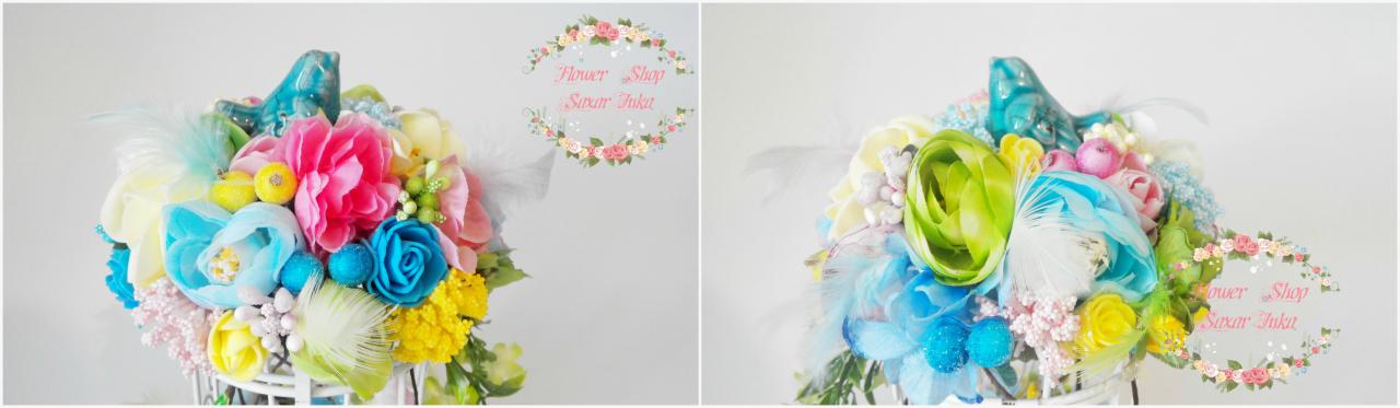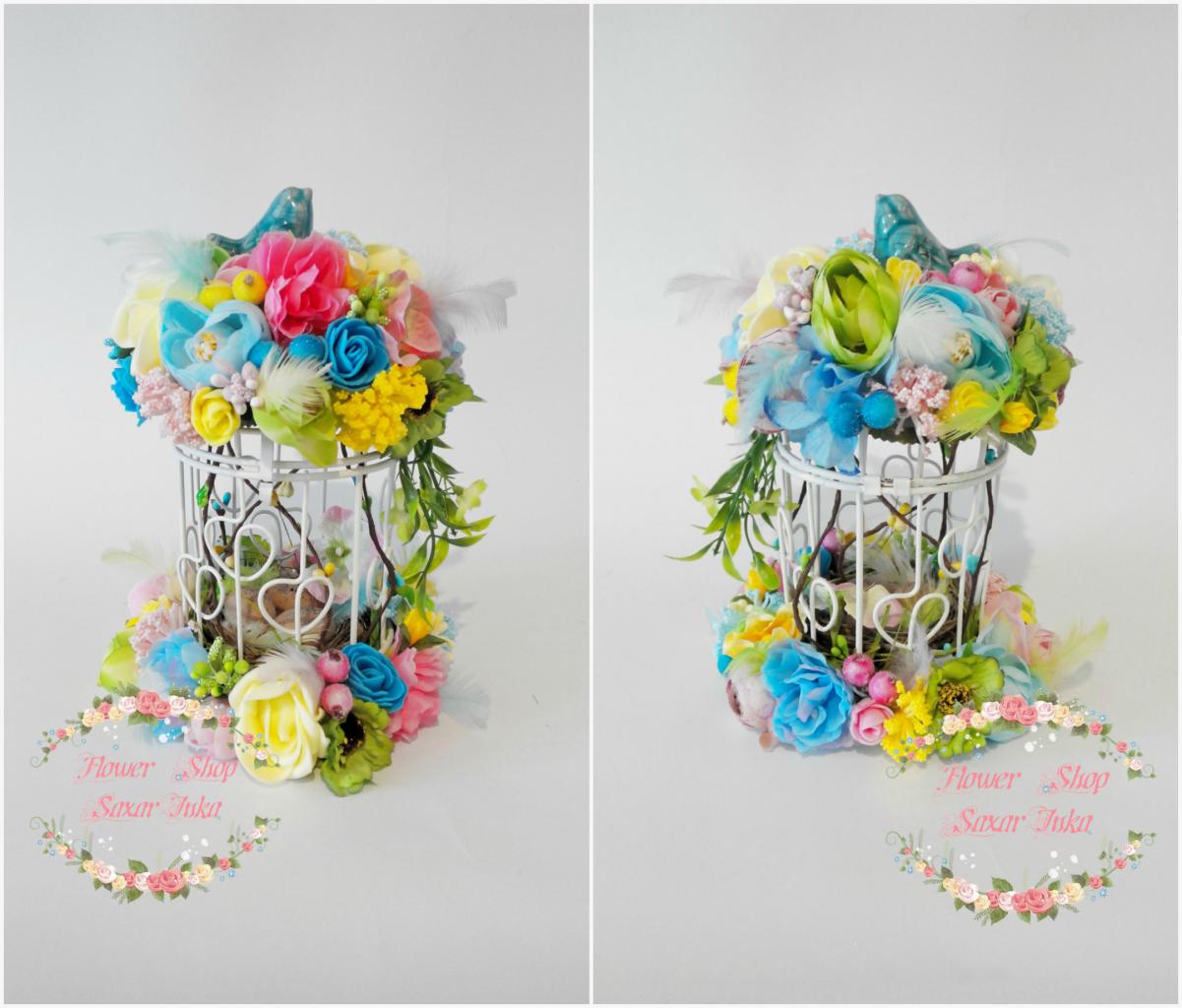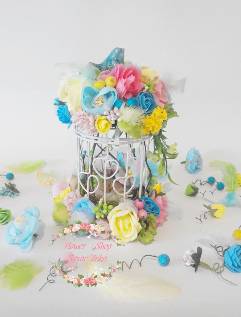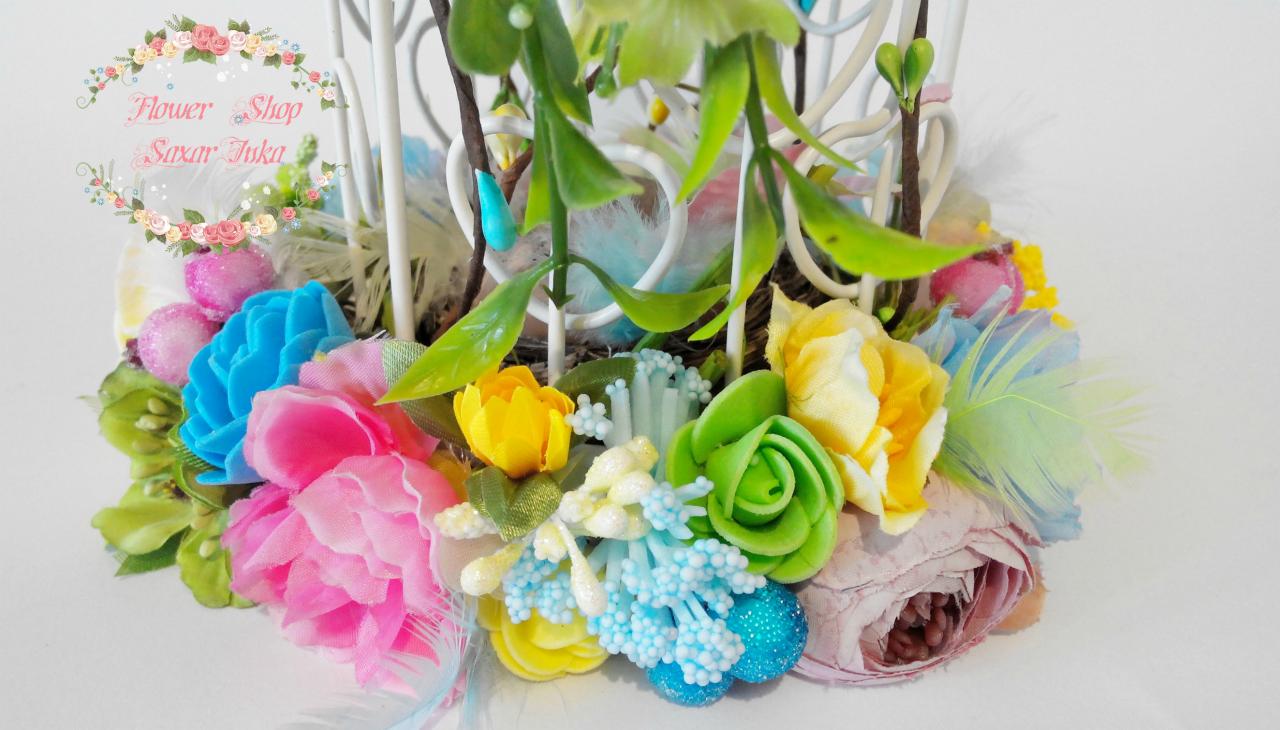 Металлическая основа,текстильные и латексные цветы,добавки, тычинки,ягодки,перья,солома,гнездышко, веточки,керамическая птичка.
