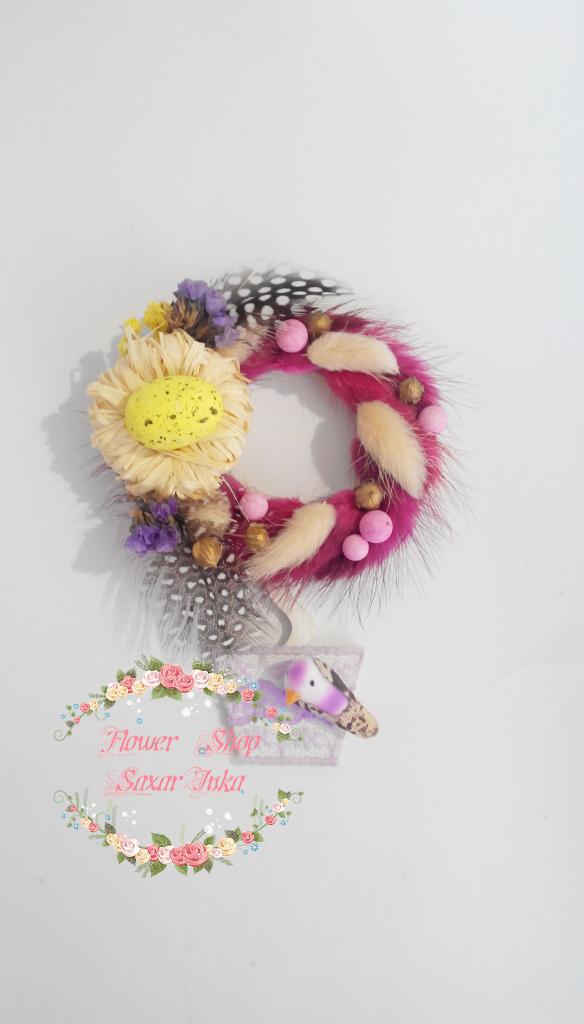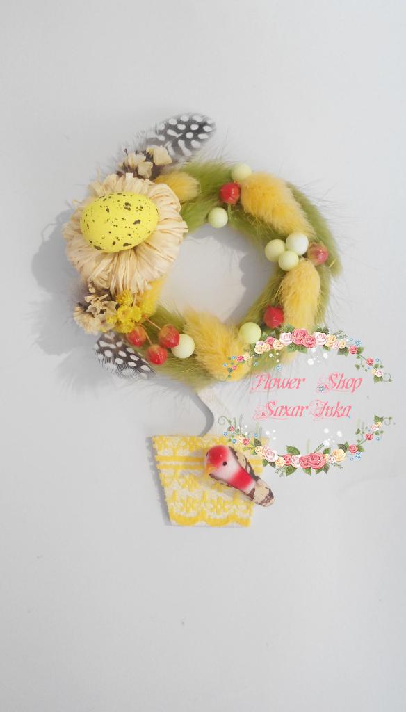 Лагурус,сухоцветы,перья,солома,кружево,пенопластов ые шарики, яйцо и птичка.