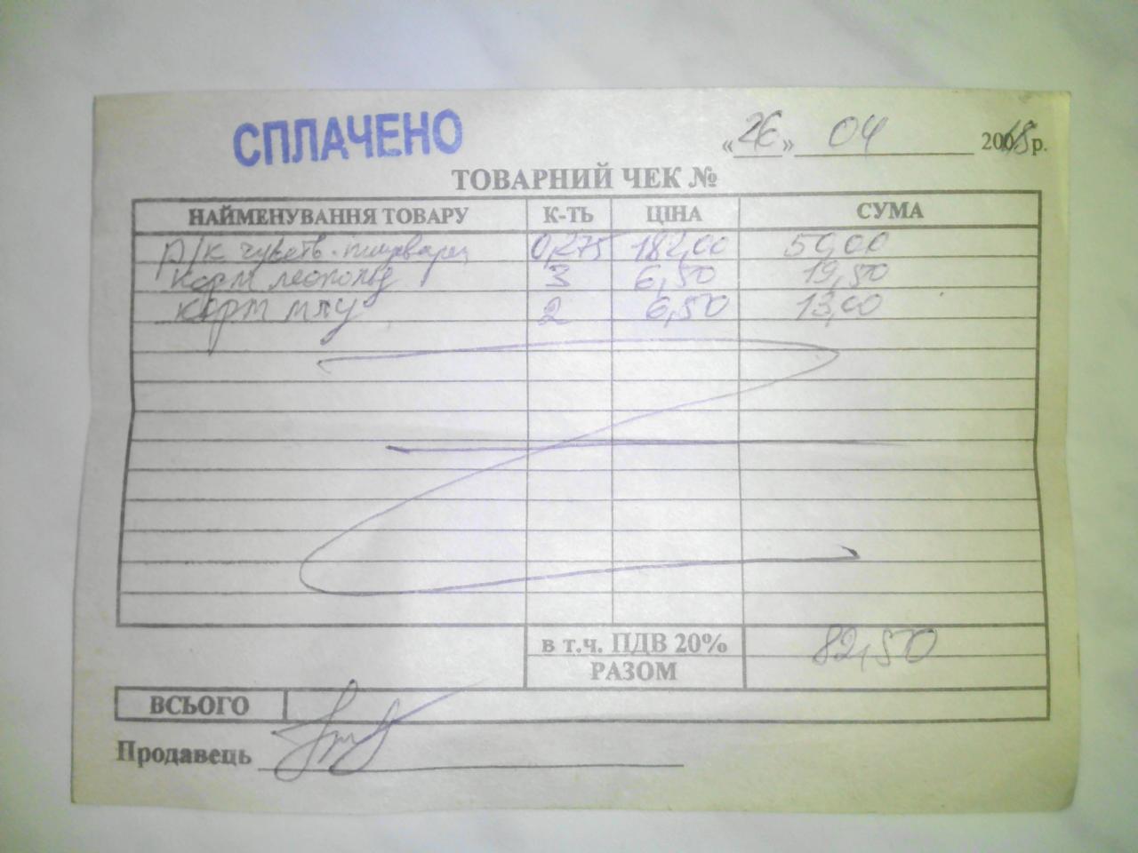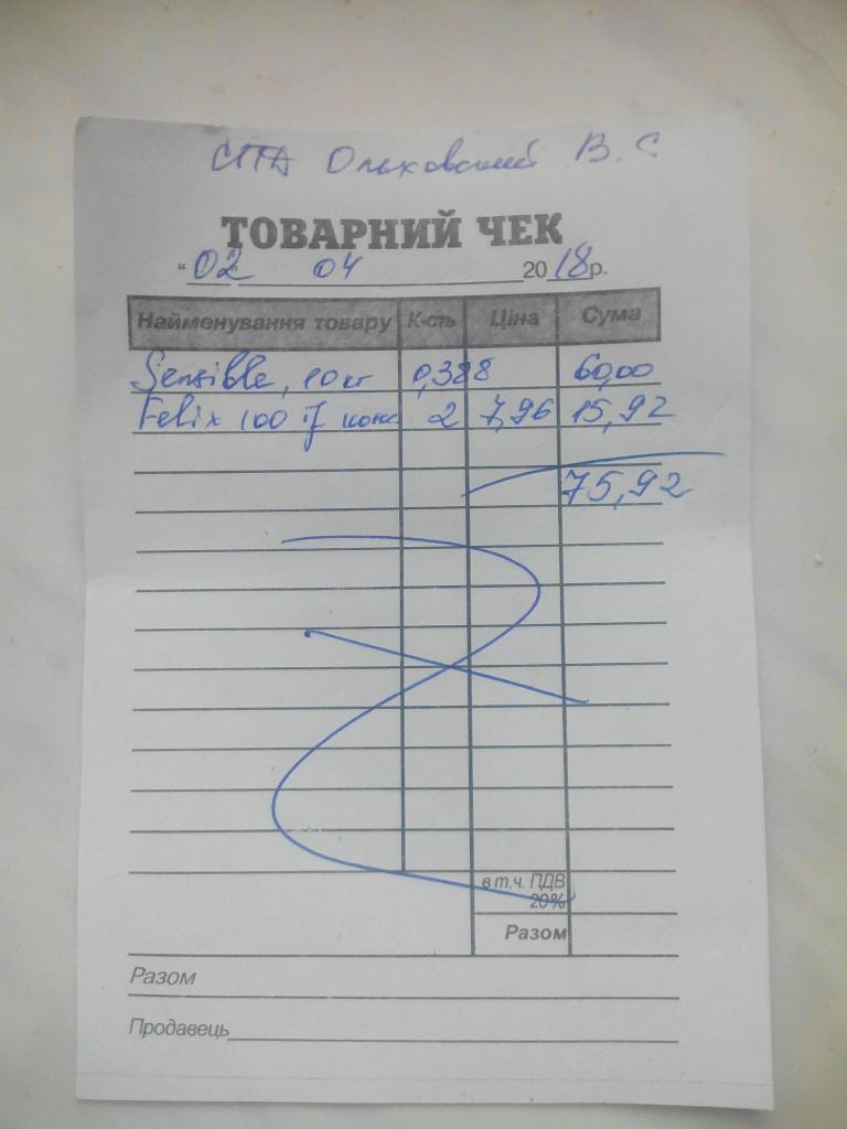 Вчера купила корм, потрачено 82,50 грн. Остаток 21 грн, еще нужно будет купить наполнитель.