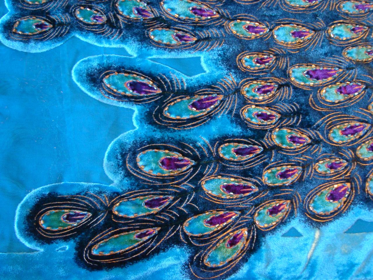 Есть бархатная шаль с павлинами Цвета морской волны. Размер180х50см.