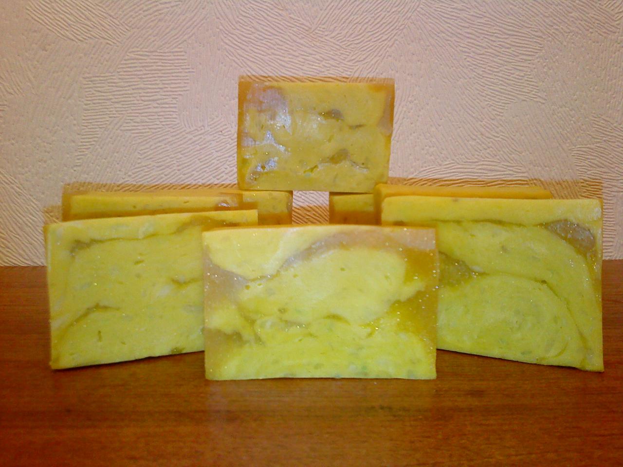 В составе: натриевые соли жирных кислот авокадо, касторового, оливкового, пальмового, пальмоядрового масел. Обогащено маслом жожоба, облепихи. В состав также входит D-пантенол, эфирные масла лимона, апельсина, иланг-иланга, благовония "зеленое яблоко". Присутствует также глицериновое мыло моего изготовления и золотая мика.