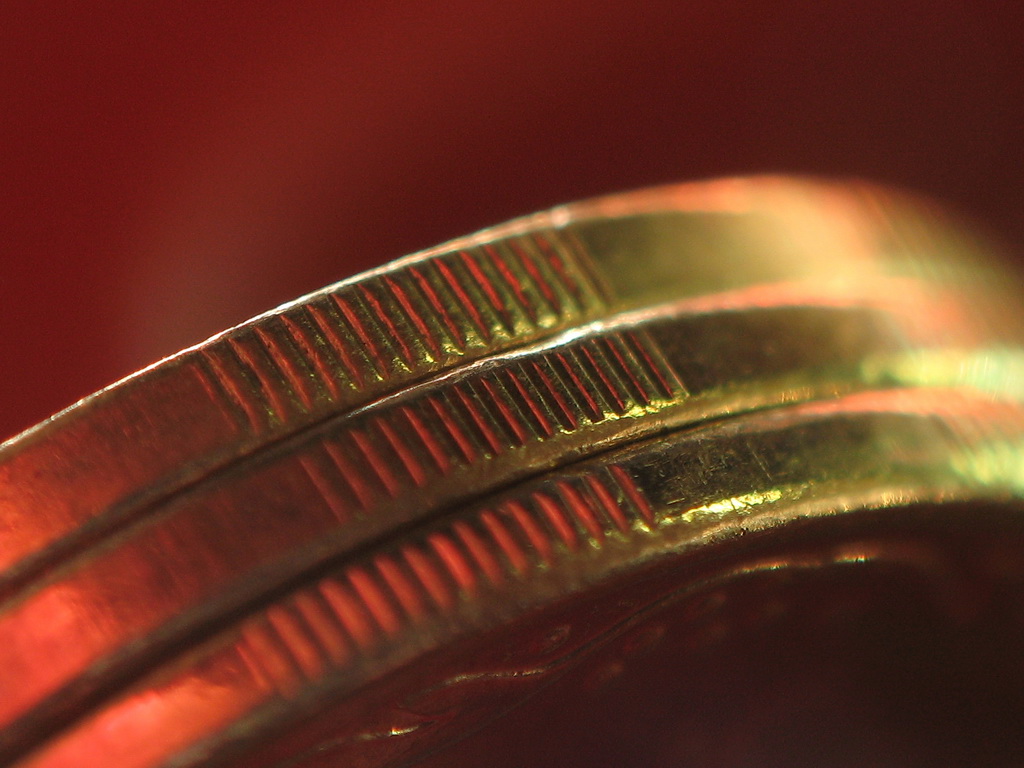 Вот еще фото, сверху и снизу обычные монеты. Зубчики на монетах 25к. 2009 немного не такие, как например на 25к. 2006, они какие-то более мелкие, не так заметны сразу. Нормально сфотографировать их довольно сложно, вживую отличия хорошо видны.
