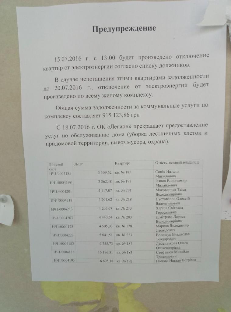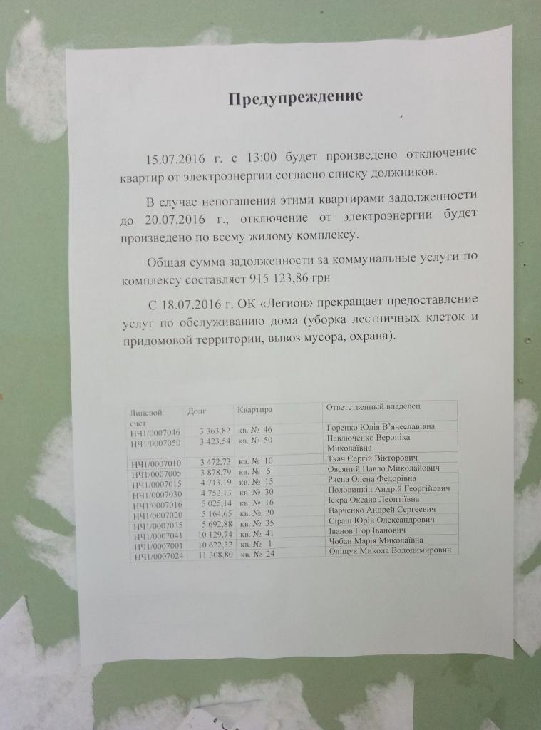 В нашій ситуації, він не виконав свої зобов'язання перед Замовником, кооперативом, а Замовник перед нами – будинок переданий в неналежному стані. Коли починаєш про це говорити, що Замовник, що Желясков переводить розмову в русло, а «ви нам винні 900 тис. за ком. послуги». Складається враження, якщо б сплатили цих 900 тис. то максимум через тиждень все було б добудовано згідно проекту. Замовник не пробує розібратись як утворилась ця заборгованість, не питає почому СДПТ за фактом (4,3-4,95), ел.енергія (1,91), хоча домовлялись СДПТ – 2,95, ел. енергія по тарифам НКРЕ. Винні 900 тис. і крапка. Тобто, той, хто сплатив за домовленими тарифами, все рівно буде мати борг, який буде тільки рости, бо тарифи домовлені і тарифи від Желяскова не співпадають. Замовник, стверджує, що перекриваючи вулицю, ми шантажуємо їх. При цьому не цікавиться, що об'ява про припинення вивозу сміття, відімкнення ел.енергії – шантаж. Тобто, знімається з тарифу комунальних послуг не якась там оренда офісу бухгалтеру, зарплата інж. з ТБ та інші «тарифні бульби», а саме обов'язкові послуги….