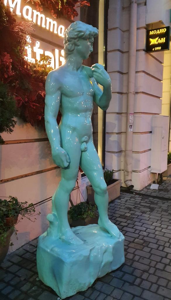 Очень симпатично украшен и внутри, и снаружи. Новогоднее настроение. Правда, и тут столкнулась с голым мужчиной. Аж позеленел от холода.