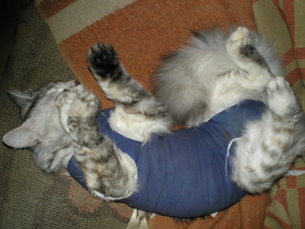 мы сняли бандаж... радости небыло предела , наконецто можно вылизатся где хочеш по шерсти а не по этой противной синей тряпке!