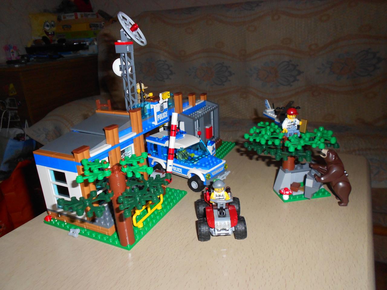 Отличный большой набор по акции 699 грн (стоил 899 грн), 6 фигурок (2 шерифа, 2 бандита, пилот вертолёта, медведь), полицейский участок, вертолёт, полицейска машина, вездеход, деревья и куча всякой мелочи)))))) Очень понравился и сюжет этого набора, и подробные инструкции, а самое главное широкие возможности для игры, есть где развернуться фантазии!