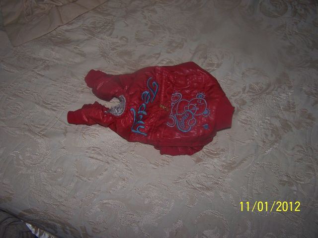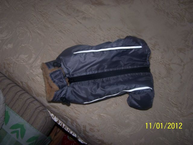 Да!...У нас основной туалет оказался возле спальни...Но есть и места-где получится.С каканьем посложнее-в туалет ну совсем не получается!Но нам пока 4 месяца и я не теряю надежду!!!Вчера получили свой комбинезон,сшитый Оксаной! Комбинезон очень славный!!!Вот только с важным органом незадача вышла....промашка!Оксана штаны забрала переделывать,поэтому их покажу,когда будут готовы.Куртка вот такая :