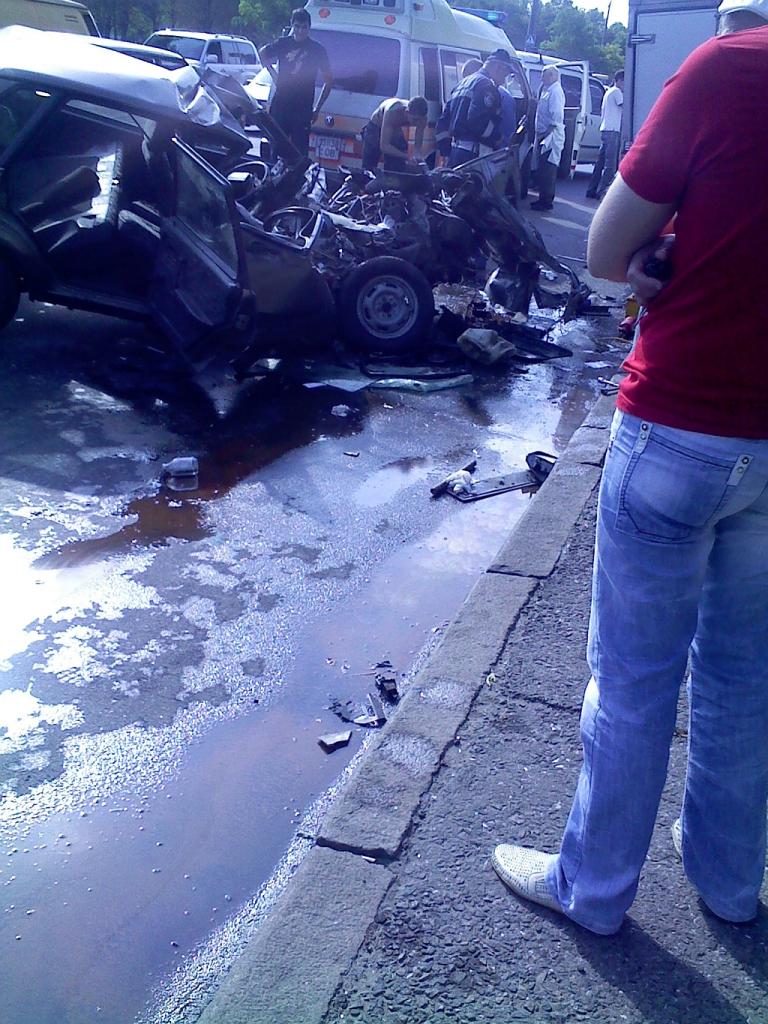 Что-то страшное происходило 40 минут назад возле второго кладбища. Серая, кажется, десятка, искореженная вплоть до задней стойки, висела правым задним колесом в воздухе. Окровавленный мужчина водой из бутылки поливал двигатель, из которого валил то ли пар, то ли дым. Врачи скорой и какие-то люди быстро извлекали кого-то с заднего сиденья. Самое непонятное то, что я не видела второго участника, каким образом произошла авария, не могу себе представить даже близко.