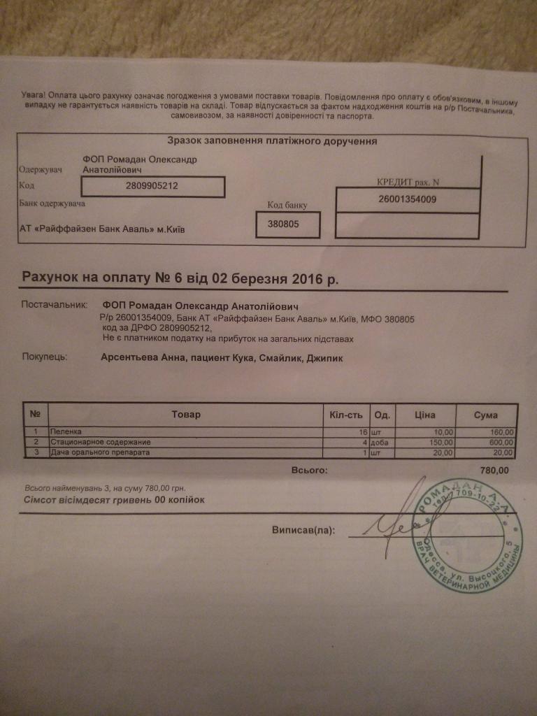 Вот счет за содержание спасенных "Горошков" в клигнике. Кука, Смайлик и Джипик