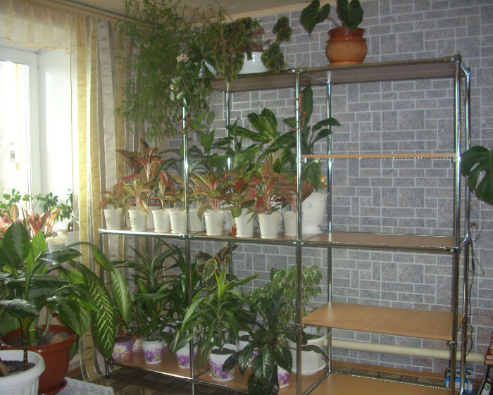 Неделю назад приобрела себе вот такой стеллажик.Так верхнюю полочку пришлось скрутить,чтоб поместились растения ,у которых рост побольше, а иначе бы в потолок упирались.