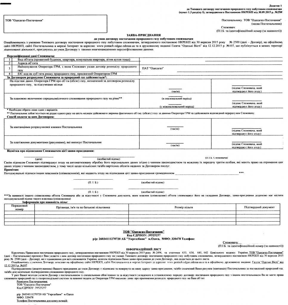 Підтвердженням (акцептуванням) Вашого приєднання до умов Договору є підписана та повернута на нашу адресу заява-приєднання та/або сплачений Вами рахунок Оператора ГРМ за послуги розподілу природного газу, та/або фактичне споживання природного газу після вручення цього листа.