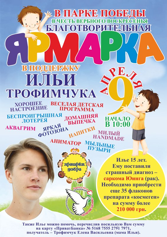 Во вторник и среду проходила ярмарка в гимназии. Дети продавали поделки, выпечку. Все деньги, собранные во время ярмарки, пошли на лечение Ильи. Не знаю, сколько собрали другие классы, наш класс собрал 1200 грн.