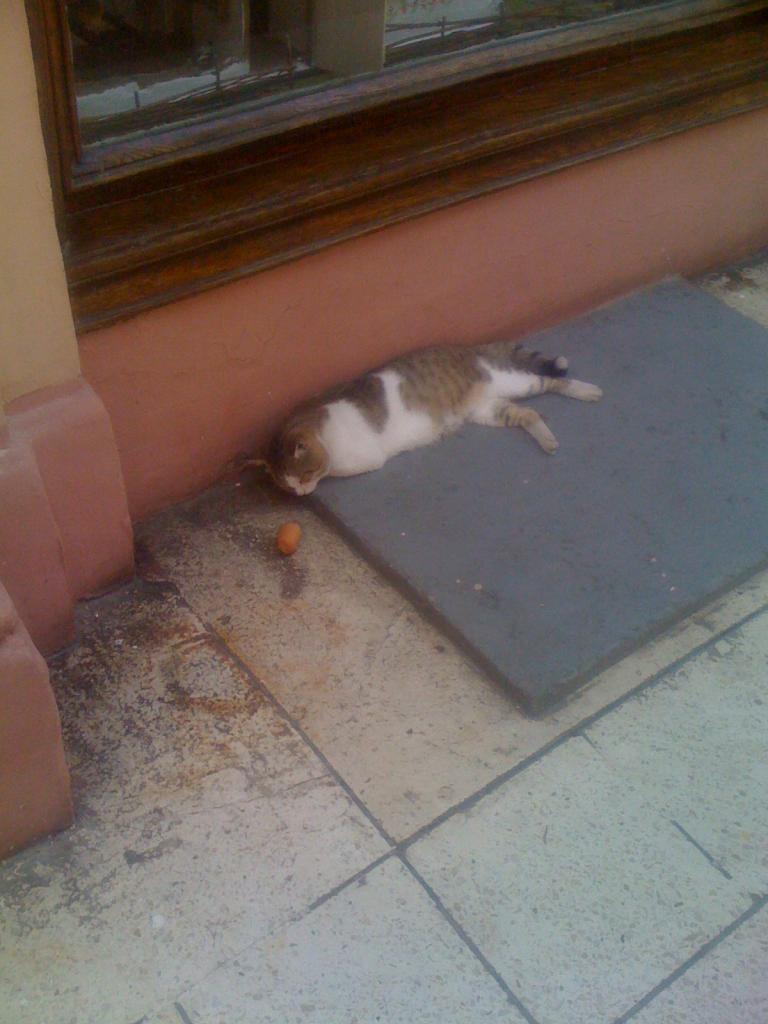 сегодня в Пассаже котофей отлично себе спал! а рядом половина сардельки ))))