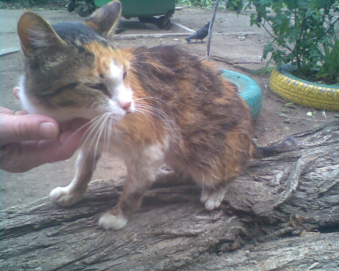 Вчера Ира(с которой мы лечили эту кошечку) пошла в тот двор где она живёт,нашла её,покормила.Маша немного поправилась,вроде шерсть стала немного лучше,поела,правда не много...со рта течёт слюна,в общем нужно отнести её на консультацию с Непейводе С.П. и уже потом принимать какое то решение.