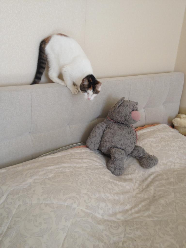Всем добрый день! Как же у нас весело!!!))) Лапка бегает за Шери, Шери бегает за Лапкой - настоящий детский садик!) С туалетом отношения состоялись, все хорошо. Спала Лапуля сегодня со мной, так что кровать уже тоже освоена причем с разбегу!) она уже отлично знает расположение всего в квартире, только бывает быстро бежит и тогда бывает конфуз конечно!)
