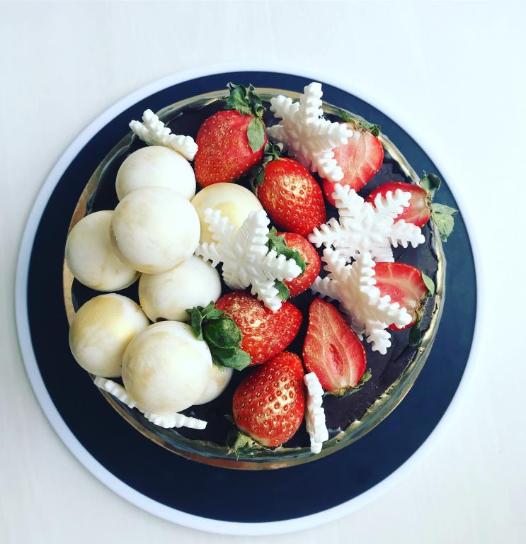 Муссовый торт с манго (тонкий бисквит, шоколадный ганаш, манговое компоте (прослойка с кусочками манго) и ванильный мусс.