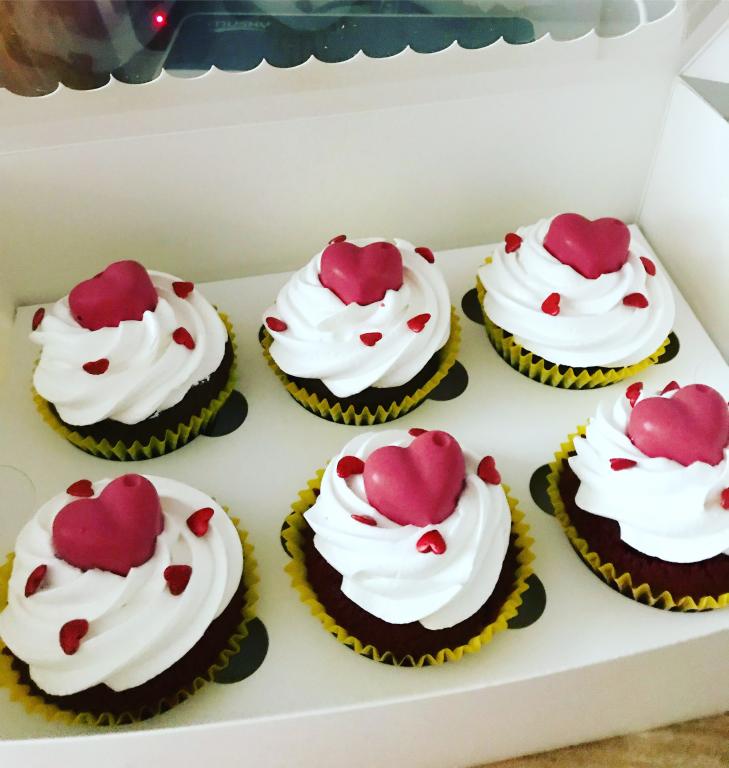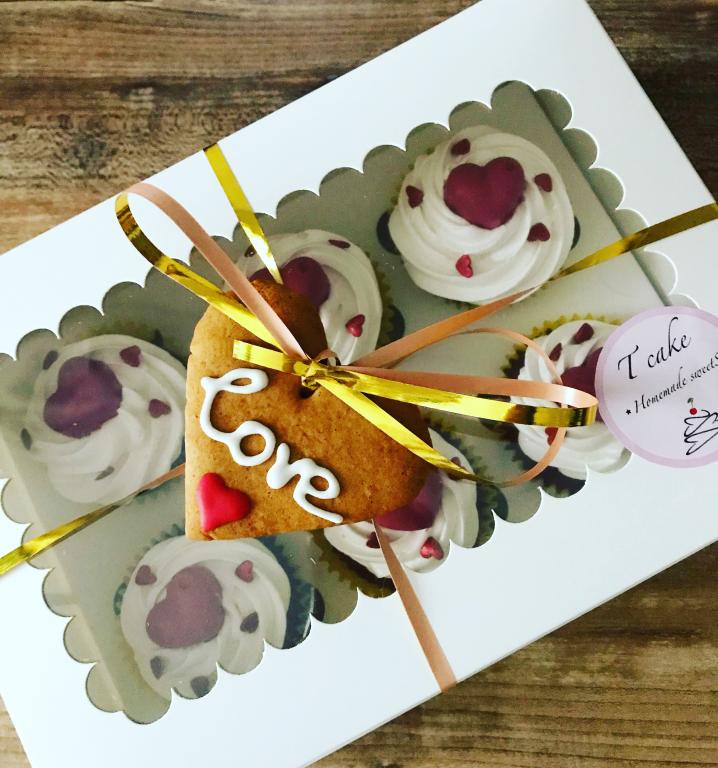 На 14 февраля будут наборы капкейков Красный бархат (капкейки красного цвета с легкой шоколадной ноткой, начинка: малиновый или вишневый конфитюр на выбор, кремовая шапочка из меренги).