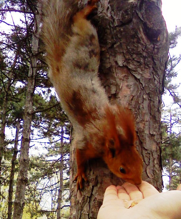 Обычно пушистые встречаютя в группах сосен, раскиданных по всему парку, но изредка и на (возле) лиственных деревьев. Заметить белок при активном передвижении (вашем) не легко - лучше остановиться в подходящем месте и неторопливо осмотреться. Часто в безветренную погоду выдают себя шумом и раскачивающимися ветвями. Заинтересованно реагируют на громкие пощелкивания языком. Белка, занятая хавчиком, на Вас внимания не обратит - ищите голодных. За час-полтора мы встречаем с десяток хвостатых и половину из них удачно угощаем. Целый орех-постараются спрятать подальше от цинкующих это дело ворон. Заранее очищенный - будут грызть на ближайщей ветке (при отсутствии резких движений с Вашей стороны). Спустится за добавкой. На орешки будут также претендовать синички , появляющиеся из ниоткуда и боязливо садящиеся на Вашу высоко поднятую ладонь. Орехи измельчаем помельче - благодарные пичуги не давятся.