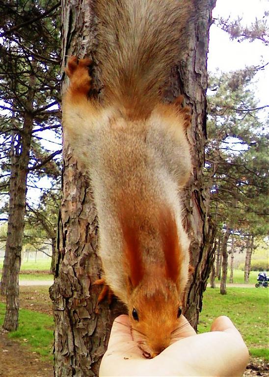 Отсняли бы и больше, так как мы с ней почти подружились и белочка нам стала доверять, но этому помешало одно обстоятельство. Недалеко от нас стоял верзила с белочкой на поводке (довольно несчастного вида), предлагающий посетителям парка сфотографироваться с ней за 20 грн. Нам он тоже предлагал это, но мы отказались. Увидев позже, что мы кормим дикую белку, он затопал ногами и бросился бежать за ней, пока не прогнал. На наш возмущенный вопрос, зачем он это сделал, он ответил, что это – конкурентка и нечего тут ему мешать зарабатывать. Наша белочка далеко не убежала, она ещё долго летала с ветки на ветку неподалеку, надеюсь, она запустила-таки ему шишку в голову (потому что у нас было очень острое желание сделать это).