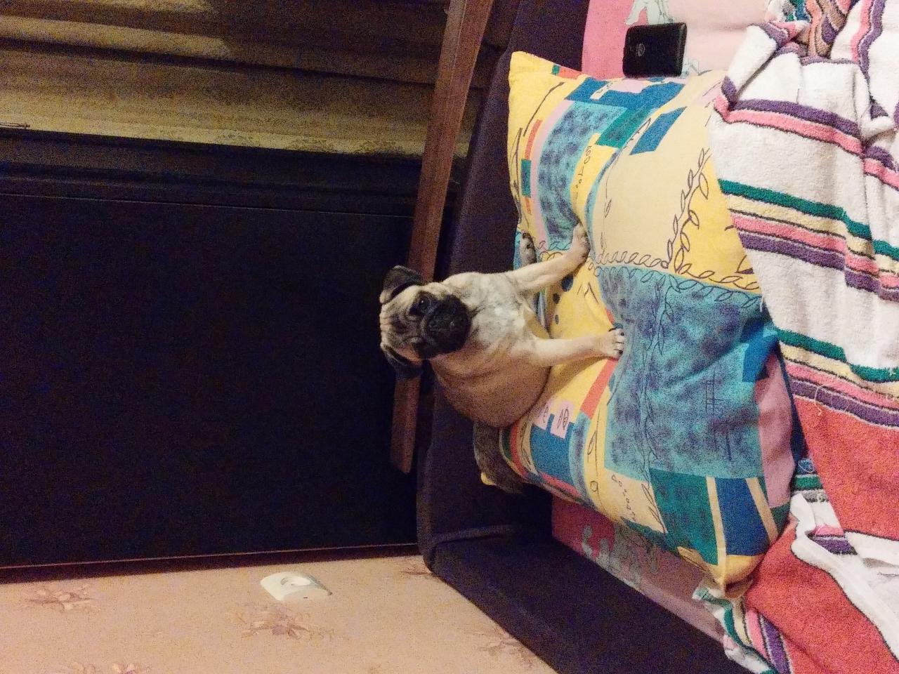 Любимое место, моя подушка)))) Сама залезть не может на кровать, я её поднимаю. Пока ворон ловлю, она уже на подушке и я пытаюсь рядом примаститься.