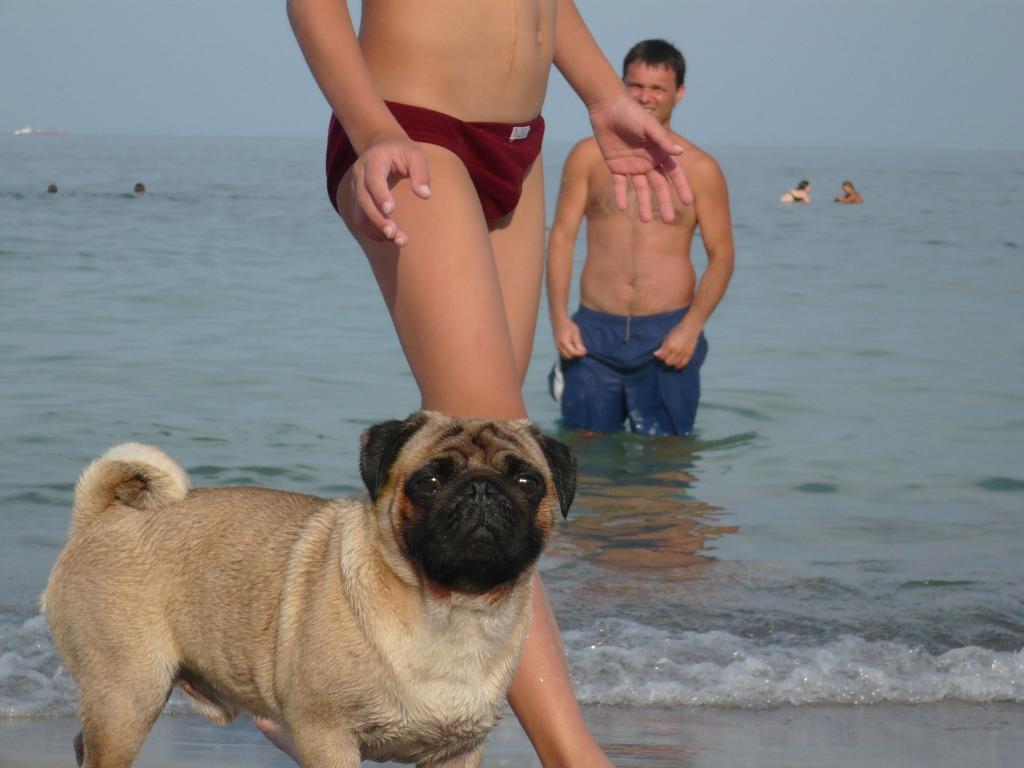 Спасибо за комплименты ))) Мы ходим на пляж возле санатория "Россия". Проблем вообще никаких, его там уже пол пляжа знает )))), мы как-то шли с моря, а за нами шла компания, они громко между собой разговаривали и один другому в разговоре сказал, что мопсика который бежит впереди зовут Буч ))). На пляже только улыбаются и детей подводят, показывают собачку ))
