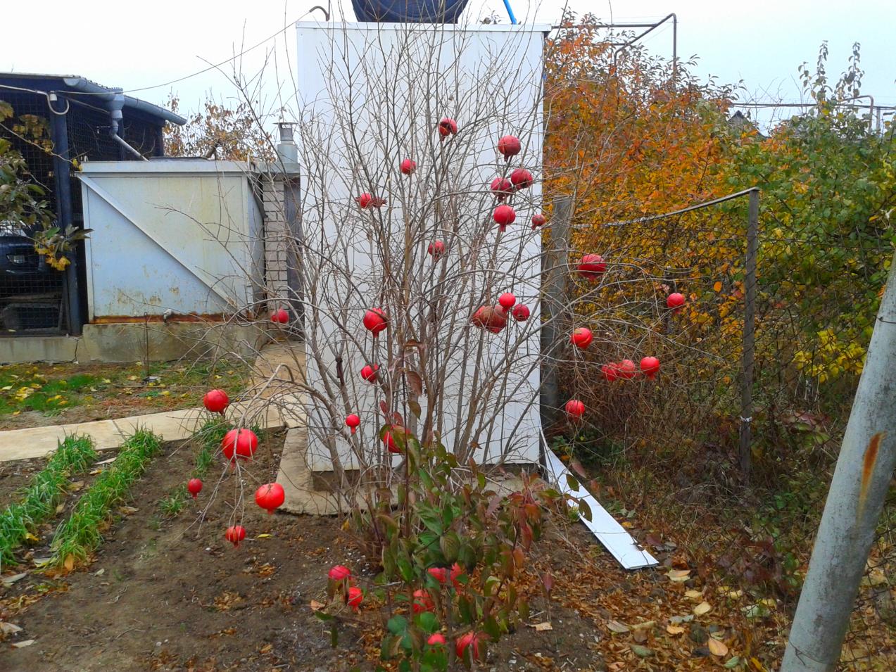 Гранат. Кустище вымахал уже огромный, сзади летний душ примерно двухметровый, даже больше наверное, вот и куст где-то такой же.