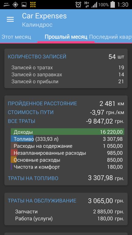 Программа считает сама. И все наглядно видно. Единственный в ней минут она считает это все как расходы на авто, и то что я в плюсе она все равно впереди ставит знак минут.