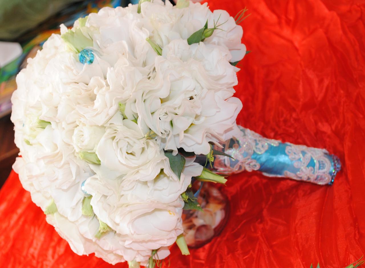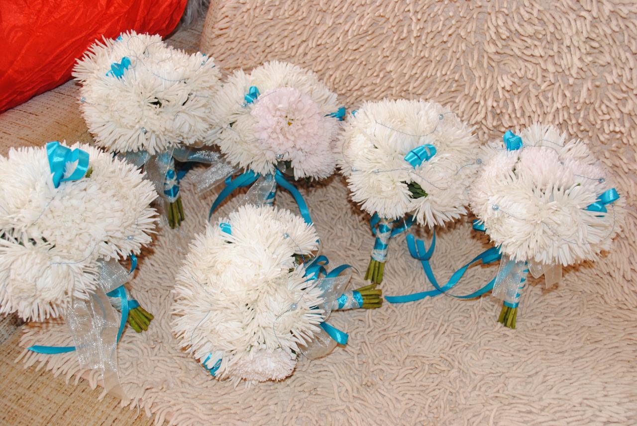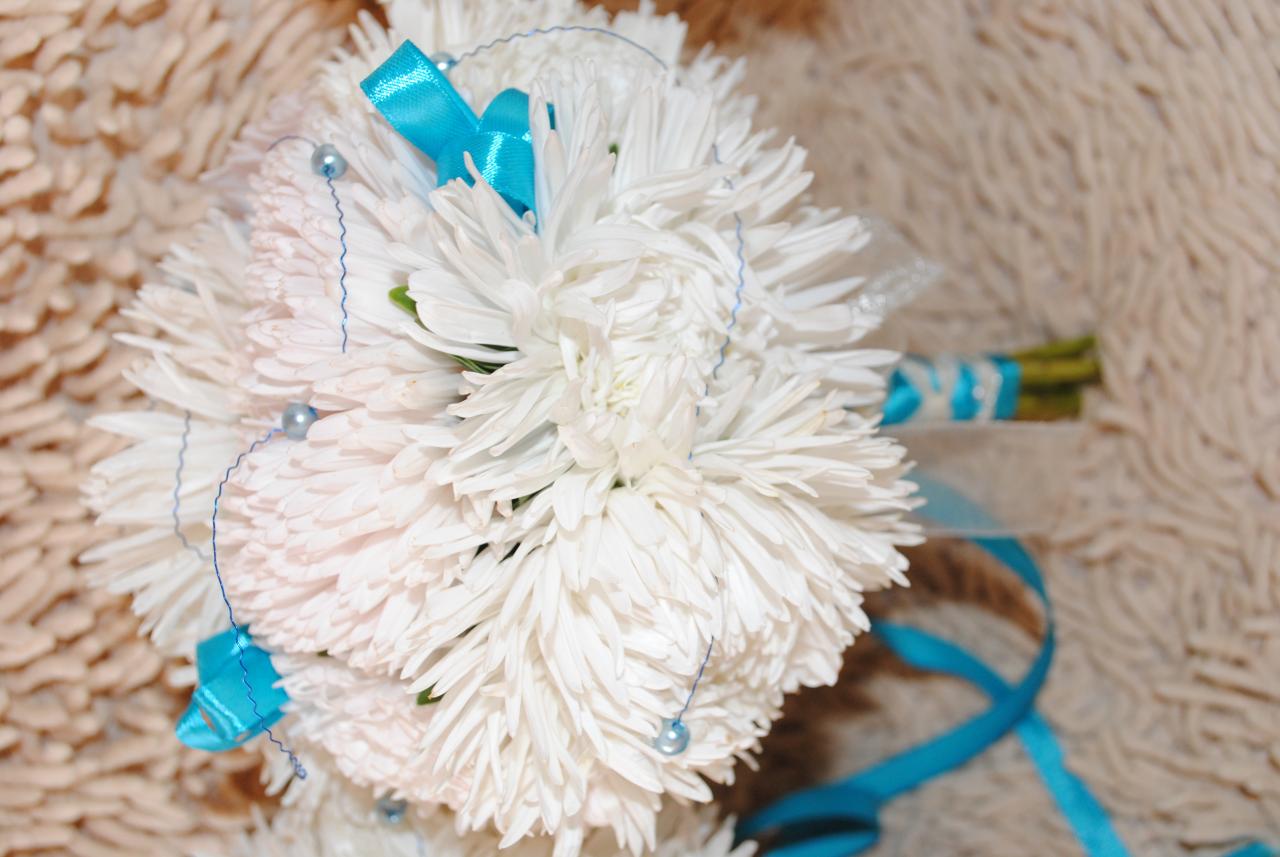 достойный вариант, если нет возможности заказать голубые цветы, заменить их лентами.