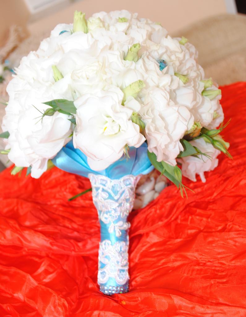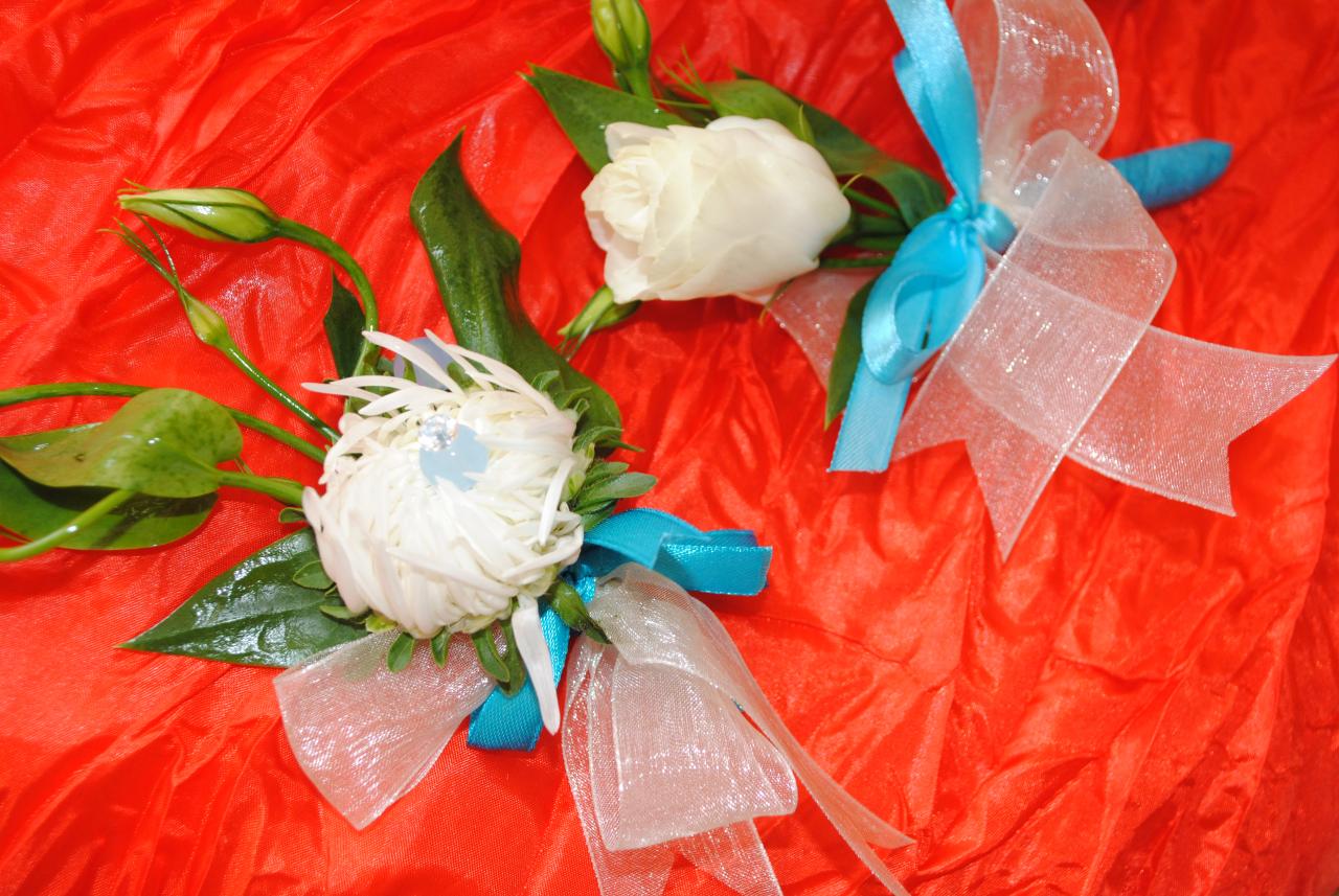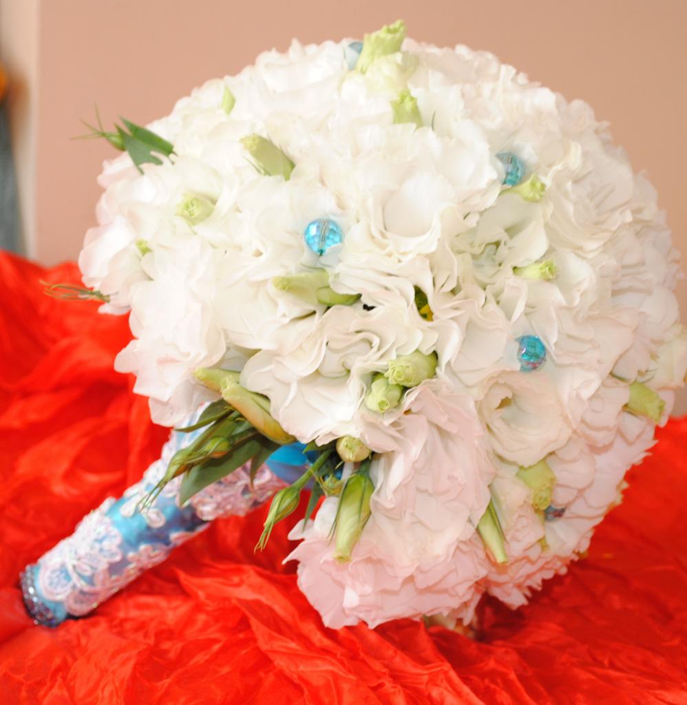 достойный вариант, если нет возможности заказать голубые цветы, заменить их лентами.