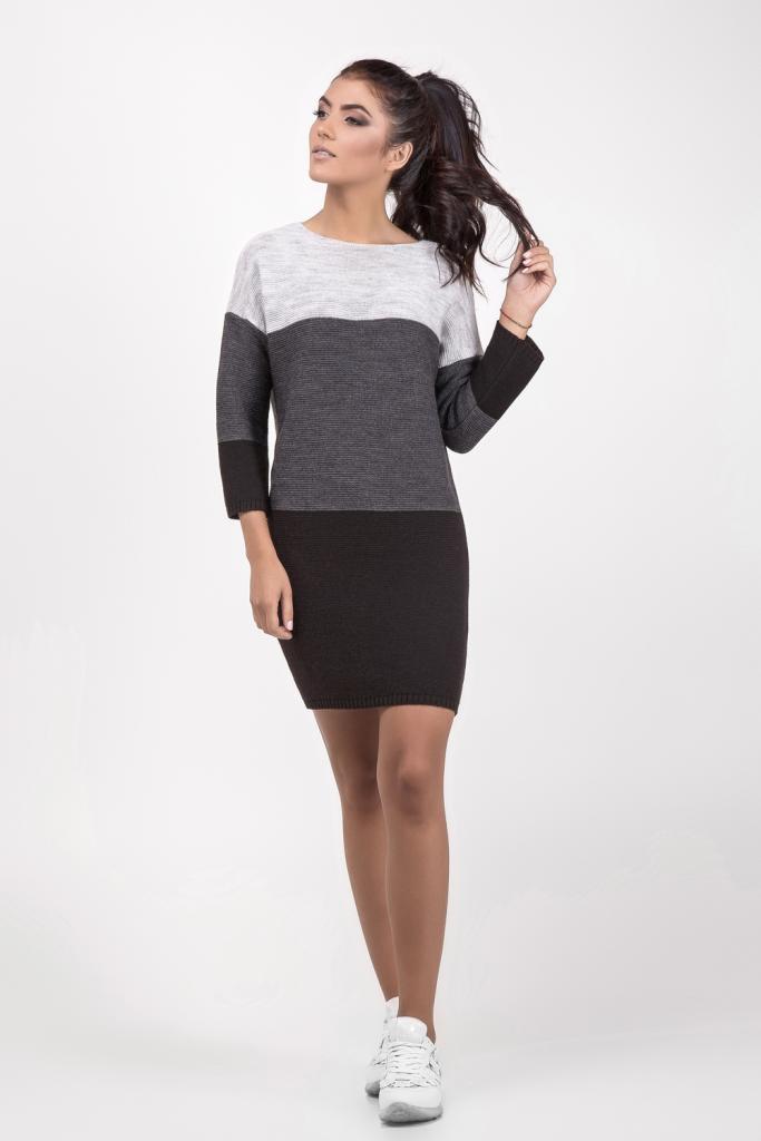 2. Вязаное трехцветное платье со спущенной линией плеча из качественной и приятной на ощупь пряжи. Прямой, слегка зауженный к низу силуэт. Мелкая, плотная вязка со слегка структурной поверхностью. Размер 46-48, длина 85 см.