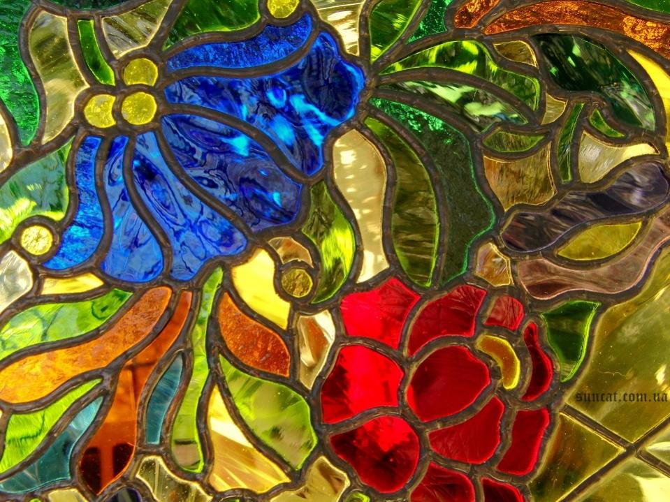 Материалы: витражное стекло различной степени прозрачности и фактуры (амер.произв-ва), более 300 деталей, возможны изменения в эскизе, по желанию. (срок изготовления - от 30 дней с момента заказа).