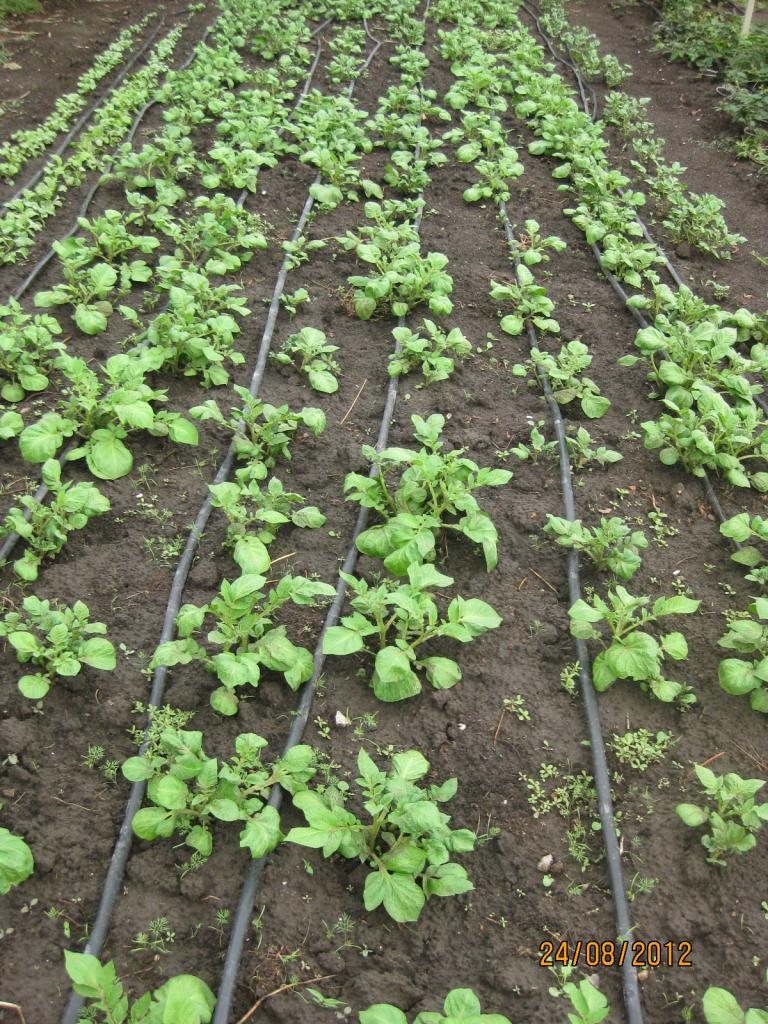 Кап. ленты ложим сразу после посадки, в жару поливали через ночь, расстояние между эмиттерами 20-30см. Т.К сажаем густо, то ленту ложим просто между рядами как получается