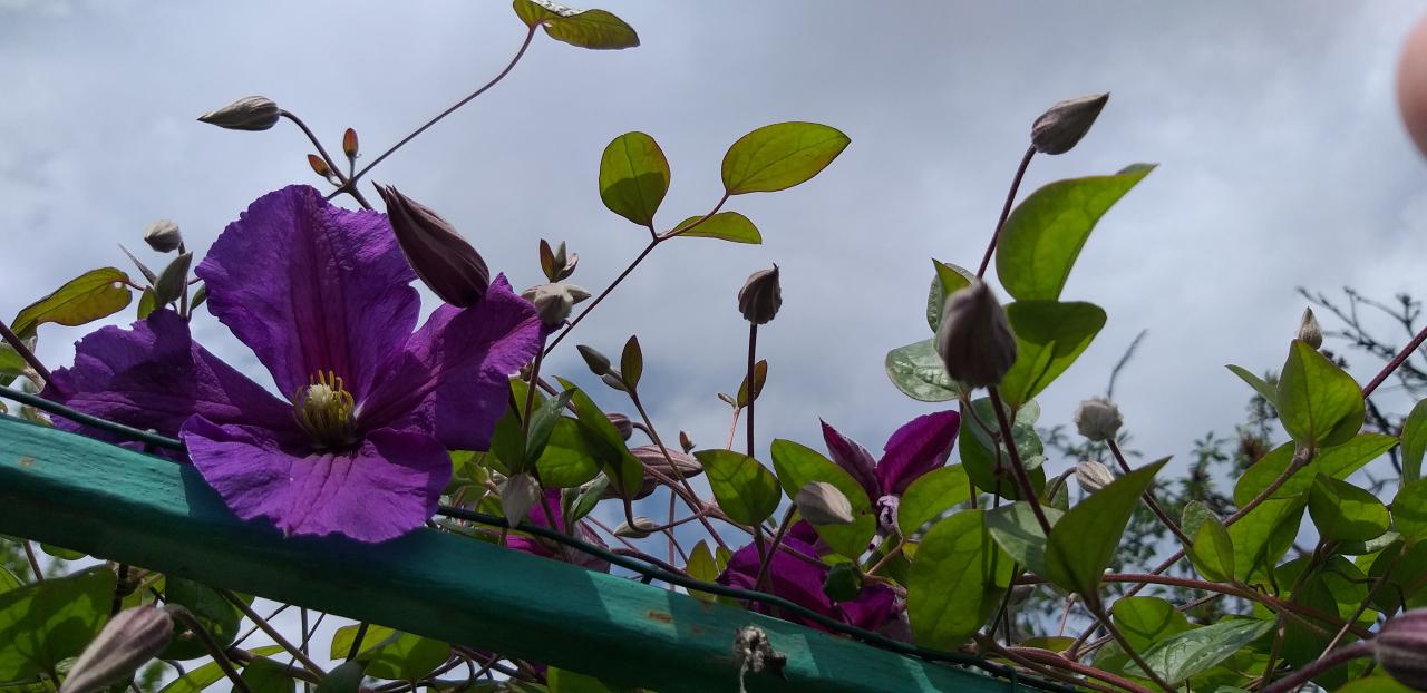 Клематис -старичок, названия не знаю. Кактусы разбушевались, миллион бутонов начинают цвести.