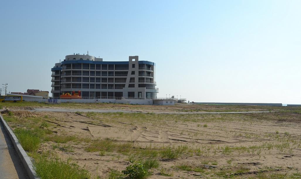 Здание стоит почти в поле , точнее прямо на песке , под обрывом ... ни кустика ,ни деревца , но повтыкали пластиковые пальмы