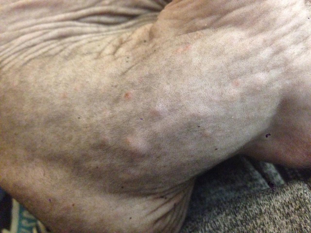 Нет, не воспалены. Нашла вот еще пару штук на теле((( на лапках как на укусы похожи, на спинке не видно, просто прощупываются под пальцами, а на шее те, что крупные похожи как на человеческие угри подкожные