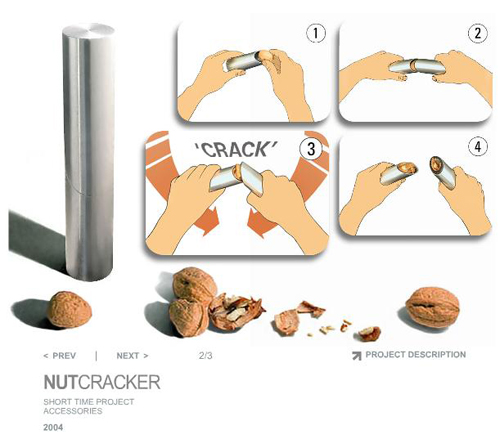 Мизерные размеры этого устройства противоречат его поистине «зловещей» функции. Для орехов зловещей, разумеется. Алюминиевая трубка содержит в себе диагональные резцы и отверстия, в которые помещается орех. Вы просто кладете его туда и поворачиваете две половинки в нужную сторону, после чего как бы скручиваете. Вуаля, орех расколот! Просто, безболезненно и, главное, никаких порезов и отбитых пальцев. Да и орех не разлетается на много маленьких кусочков, а остается цельным, если правильно пользоваться щипцами.