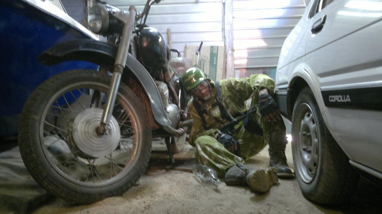 Это я тут чудачил тоже на участках , переодевался в ганса и гонял на мотыке по посёлку , никто не узнал меня пока не снимал каску и очки , ржака была только среди своих особо знакомых , остальные только челюсть руками держали и я был в полной безопасности на дороге