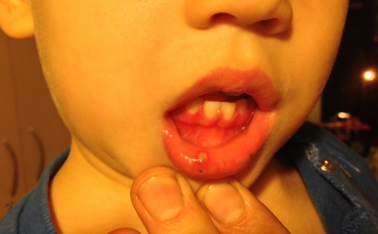 Накануне в четверг, разбил губу об голову старшего брата во время игры. Вот язвочка образовалась на этом месте.