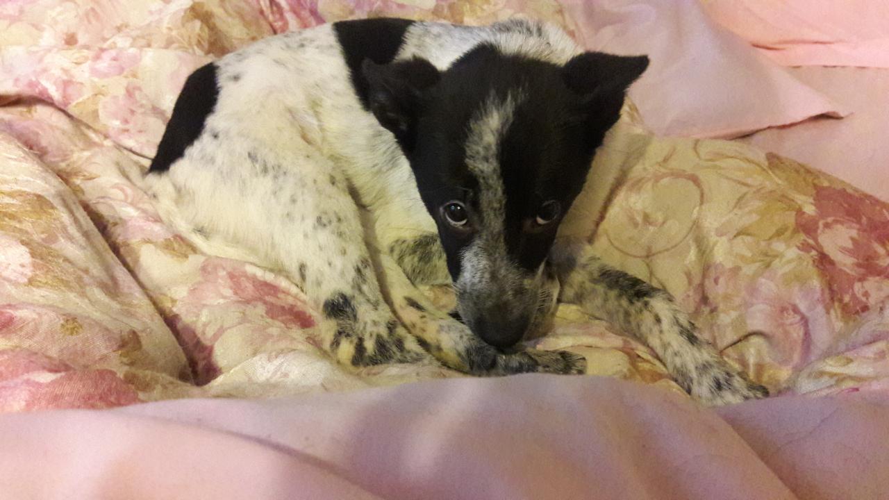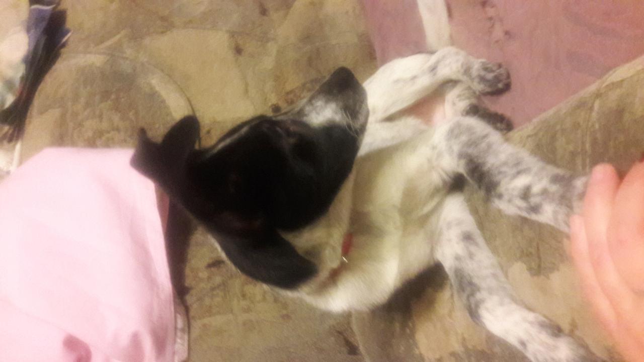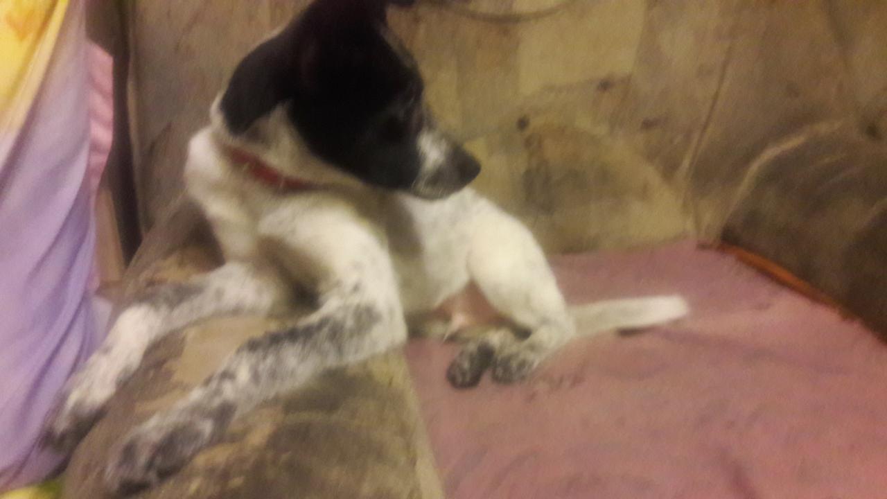 Мультик очень ладненький, пропорциональный щеночек, в жизни оказавшийся не таким великаном, каким я его представляла на новых фото. Он прямо спаниель, но со стоячими ушками, весь пятнисто-крапчатый. Иногда очень напоминает Бубу, только, конечно, поменьше размером. Купленная каучуковая косточка его не вдохновила, но надеюсь, что она ему понравится, как и красный ошейник шипами наружу). В общем, очень компактный уютный щенок, не такой уж большой, каким получился на фото.