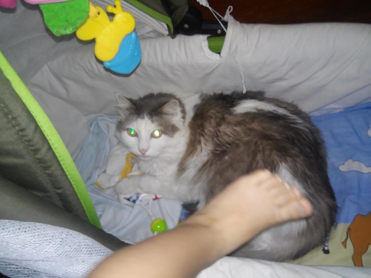наглая морда в люльке. Нога -это старшая встала на защиту коляски брата))