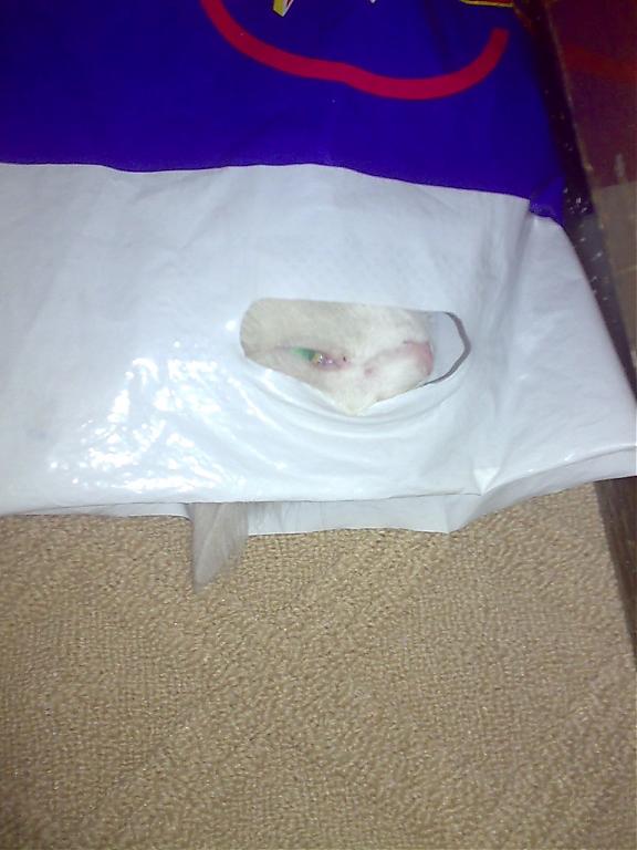 Думаю: - чем это кот шуршит при ходьбе? Оказалось, сел на пакет и тот к нему прилип.![]()