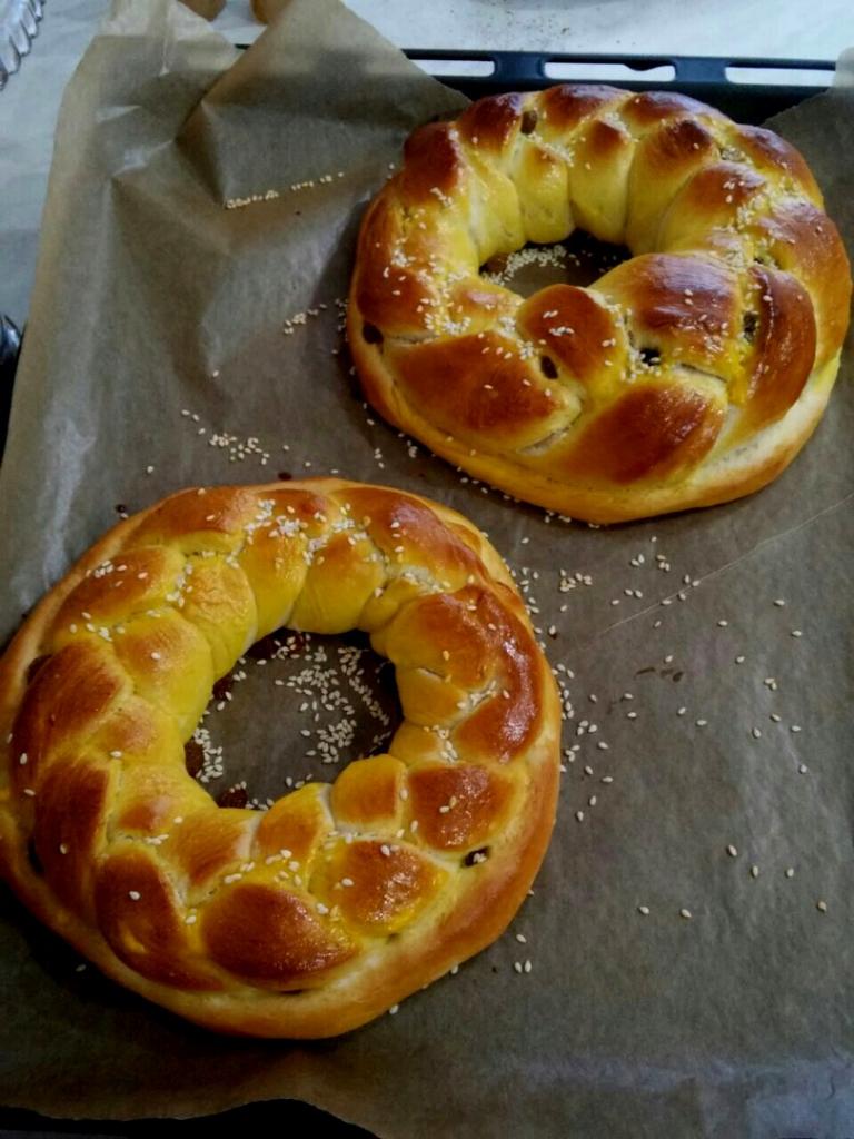 Сформировать изделия, дать подойти, смазать верх разболтанным яйцом с ложкой молока или крепкой заварки, выпекать в разогретой духовке 180 градусов до румяности.