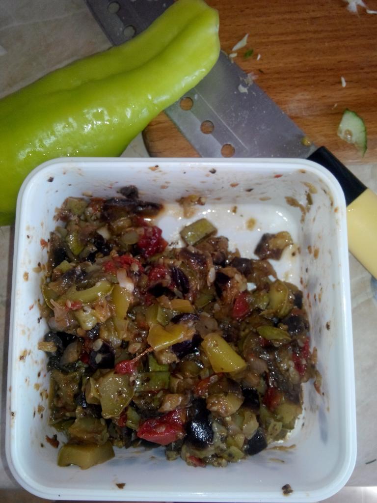 2 баклажана,2 кабачка, 1 перец,1 большой помидор,1 большая луковица,2 зубчика чеснока.