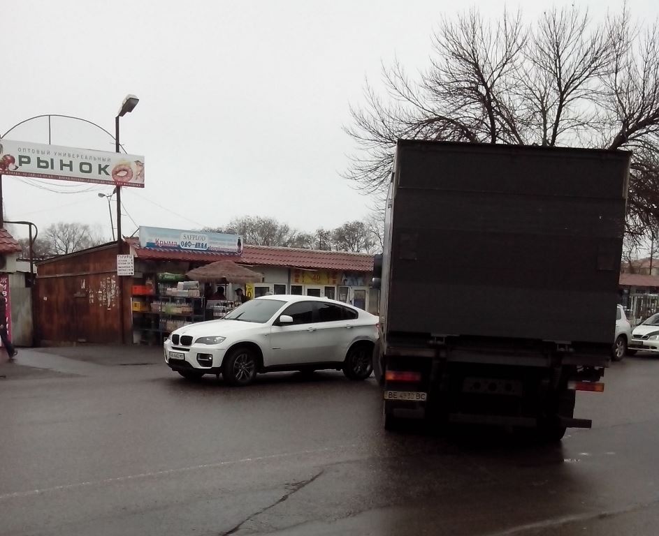 Грузовик ехал со стороны Черноморки и пытался повернуть налево в ворота оптового рынка.Навстречу ехал БМВ х6.Их траектории пересеклись.Стоят ждут ГАИ.