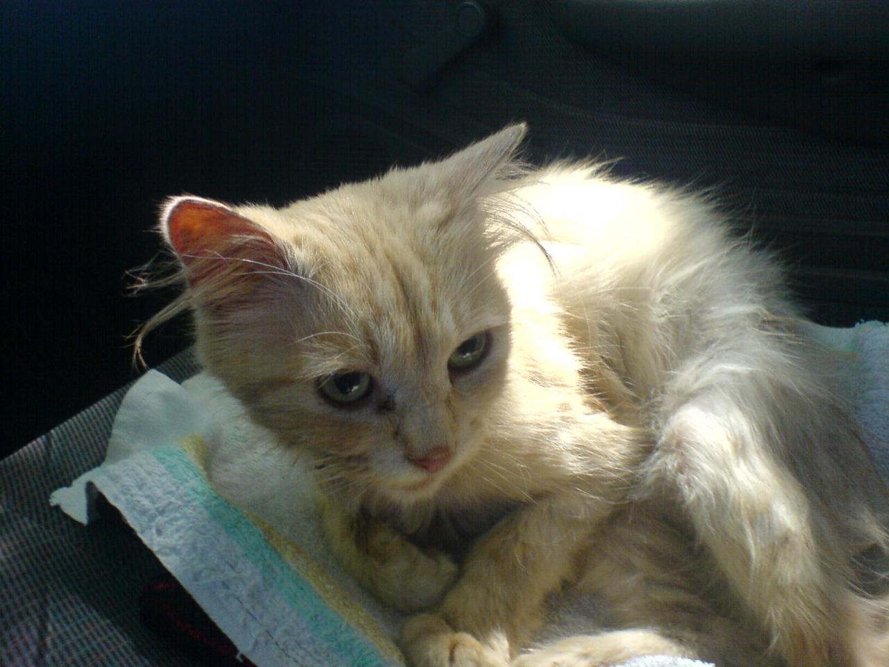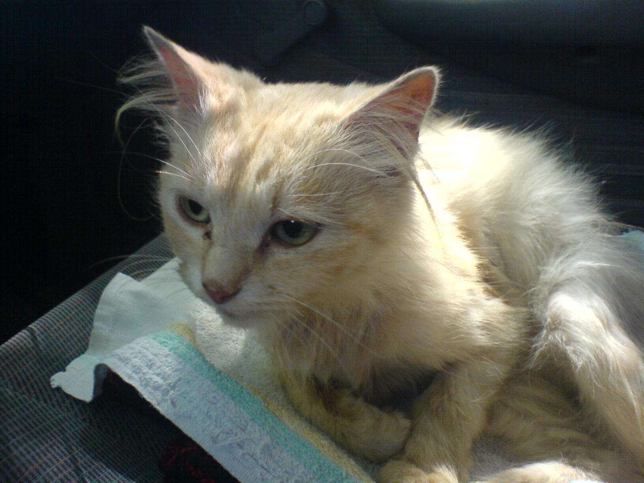 Эту кошку явно выгнали из дома. Она прибилась к моему парадному. Она очень ручная и общительная. Я её подкармливала. Шло время и я начала замечать как её шерстка стала приходить в ужасное состояние, по ней ползает куча блох, особенно заметных на светлой коже. Хвост сбился в валенок. Грязная и вонючая шерсть клочками. Спала эта кошечка в ямке прямо на земле, не обращая внимания ни на собак, ни на людей. Бывало выгоняла её из под колес автомобилей, где она грелась на солнце. Сердце сжималось, глядя на неё. Я на работу - она встречает, я с работы - она уже ждет. Потом заметила, что течет грязная слюна и постоянно мокрая щека. А ведь скоро настанут холода и с таким состоянием шерсти ей трудно будет на улице. Домой взять я её не могла, потому что у меня кот - не кастрированный и не привитый (еще предстоит). И однажды я решила прекратить мучения кошечки. Заманила ее в машину едой и повезла в клинику. Сейчас Соня на лечении в Новой Долине. Спасибо Ксении Акварель. У нее инфекция и понадобилось проколоть ей циклоферон (дорогой, однако, препарат). Планирую её подлечить, стерилизовать и найти хорошие ручки. Такой кошке не место на улице!