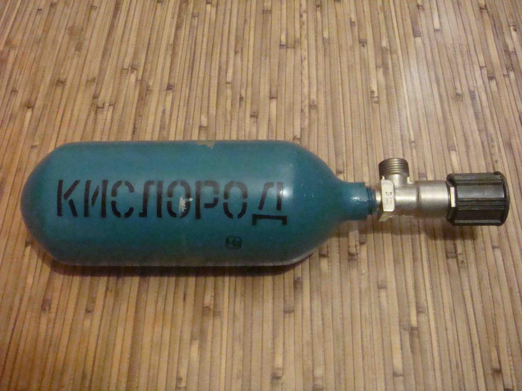Фото в студии. Стальной баллон емкостью 1 литр с винтилем, наполненный кислородом.