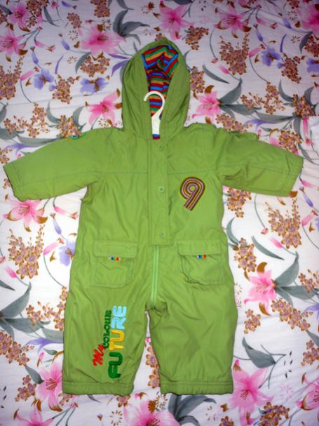 4. Демисезонный комбинезон, пр-во Украина (Киев). размер 80, реально до 78 см где-то, носили пару недель с 1,4 до 1,5. в комплекте отстегивающиеся варешки и пинетки (не носили). очень качественный, натуральные ткани, приятная цветная в полоску х/б покладка, верхняя ткань с приятныя напыление, что позволяет некоторые загрязнения просто вытирать влажной тряпочкой. мы им остались очень довольны. сохнет быстро. состояние отличное.