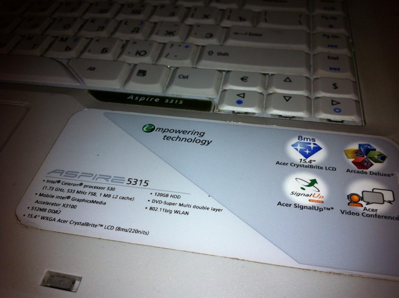 Acer Aspire 5315 Notebook Laptop, Celeron M530 1.73GHz, 15.4" TFT, 1024MB RAM, 80GB Hard-drive, DVD±RW, Intel Graphics Media Accelerator X3100, WiFi, Vista Home Basic
