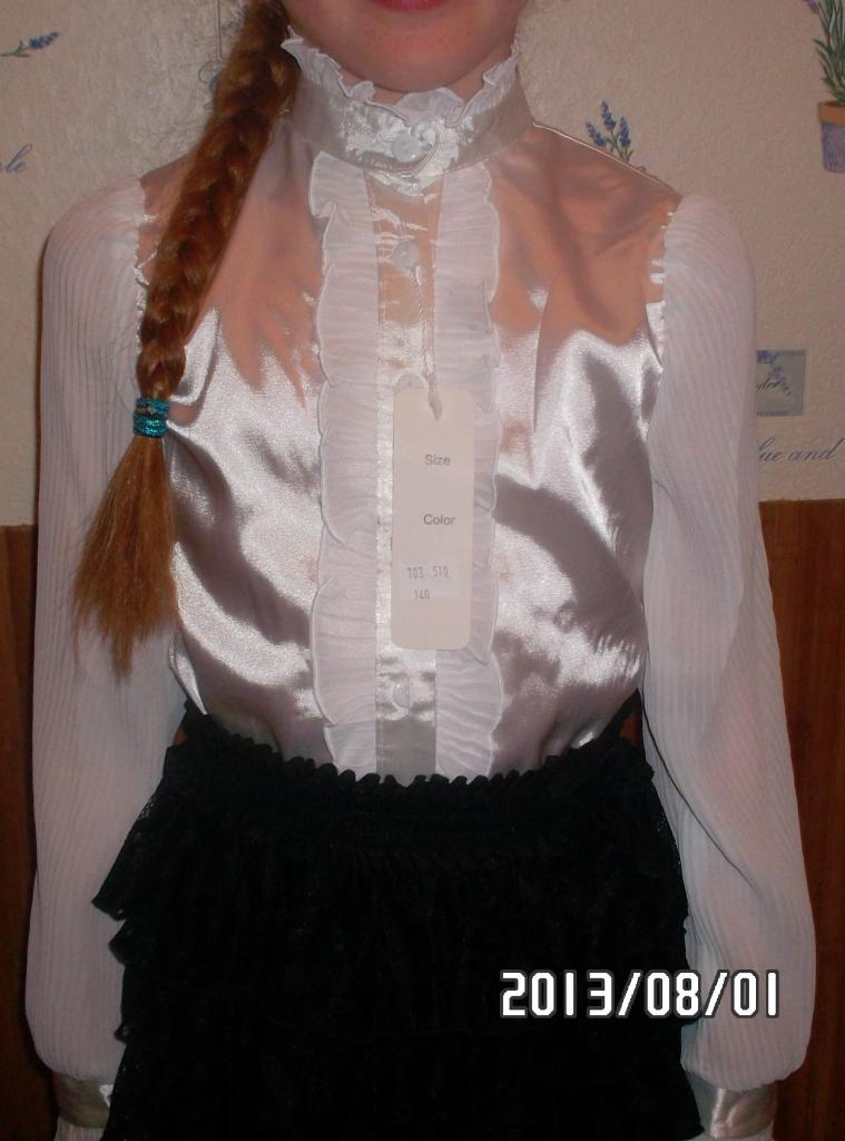 Продам Блуза атласная с шифоновым рукавом и рюшем,воротник стоечка,полномерка,"хорошая"длина рукава,дочка в 140 р,российская фирма «RAVOL»,заказывала сама в СП,пришла двойная ростовка.