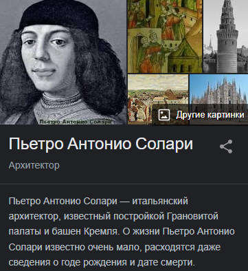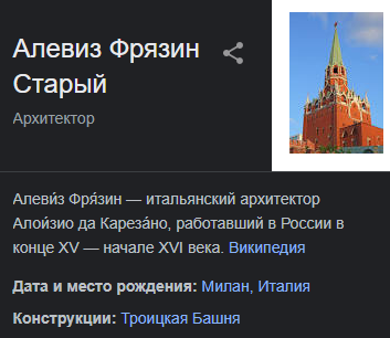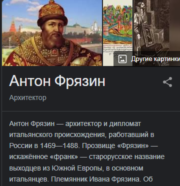 В 1485—1516 годах строительство стен Кремля возглавляли итальянские зодчие Антон Фрязин, Марк Фрязин, П. А. Солари и Алевиз Фрязин Старый.